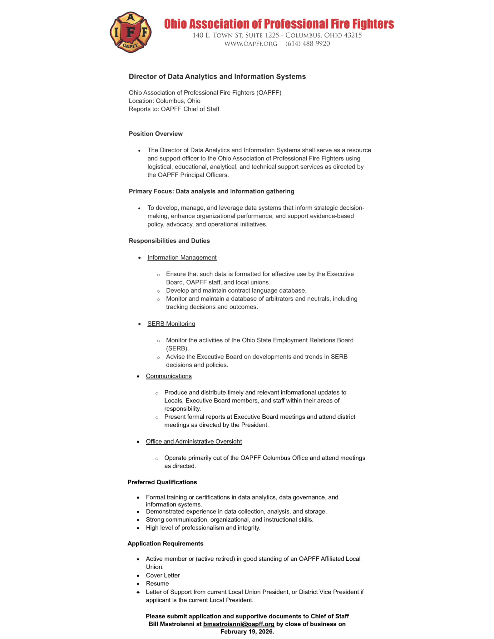 Jeff has served the OAPFF on various committees, including Legislative, Secondary Employment, Constitution and ByLaws, Governmental Affairs Director Hiring, and OAPFF Policy. He is also a former trustee of the Ohio Police and Fire Pension Fund. He has attended numerous IAFF, OAPFF, Ohio Ethics Commission, and arbitration and advocacy trainings. He has also studied at the IAFC / IAFF Labor Management Alliance, the International Foundation of Employee Benefit Plans, and the National Conference on Public Employee Retirement Systems. Jeff is a third-generation firefighter, with brothers serving as police officers. He resides in Fairfield, OH with his wife and have two children.